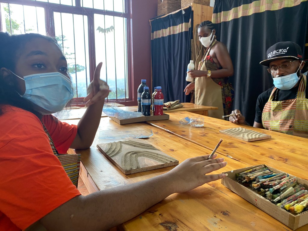 We have engaged in many cultures activities like: visits to the Inema Art Center and Choose Kigali Art Gallery; cultural experiences with ZaNiheza (pottery making, imigongo painting, dressing in traditional attire, and eating popular traditional foods). We enjoyed adventures to see different regions of the country with Choose Kigali (Akagera National Park safari, a boat ride on Lake Kivu, and driving tours of the eastern, southern and northern regions including a tour of Musanze and Gisenyi).